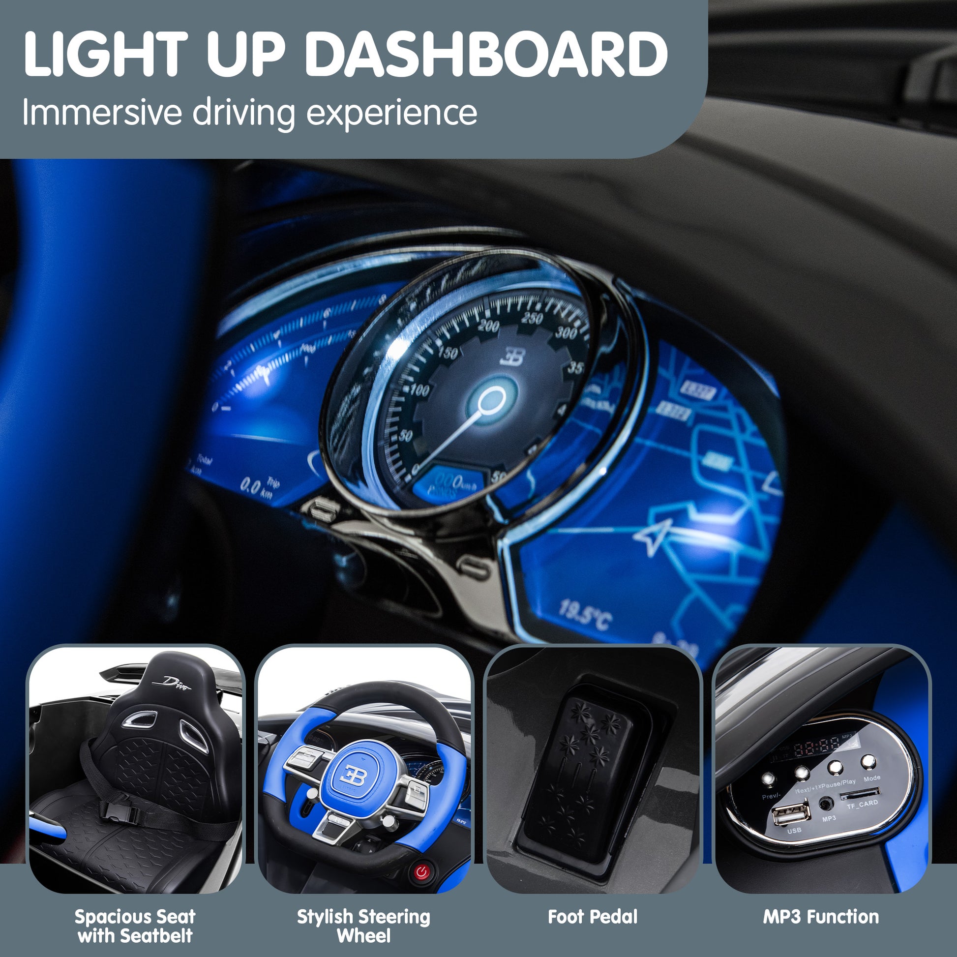 Interactive elements such as the press-to-start button, power display and music volume controls add excitement to the adventure. This ride-on, with SAA-certified cables and a high-end design, is perfect for kids ages 3 to 8, combining thrill with safety for a joyous neighbourhood cruise.