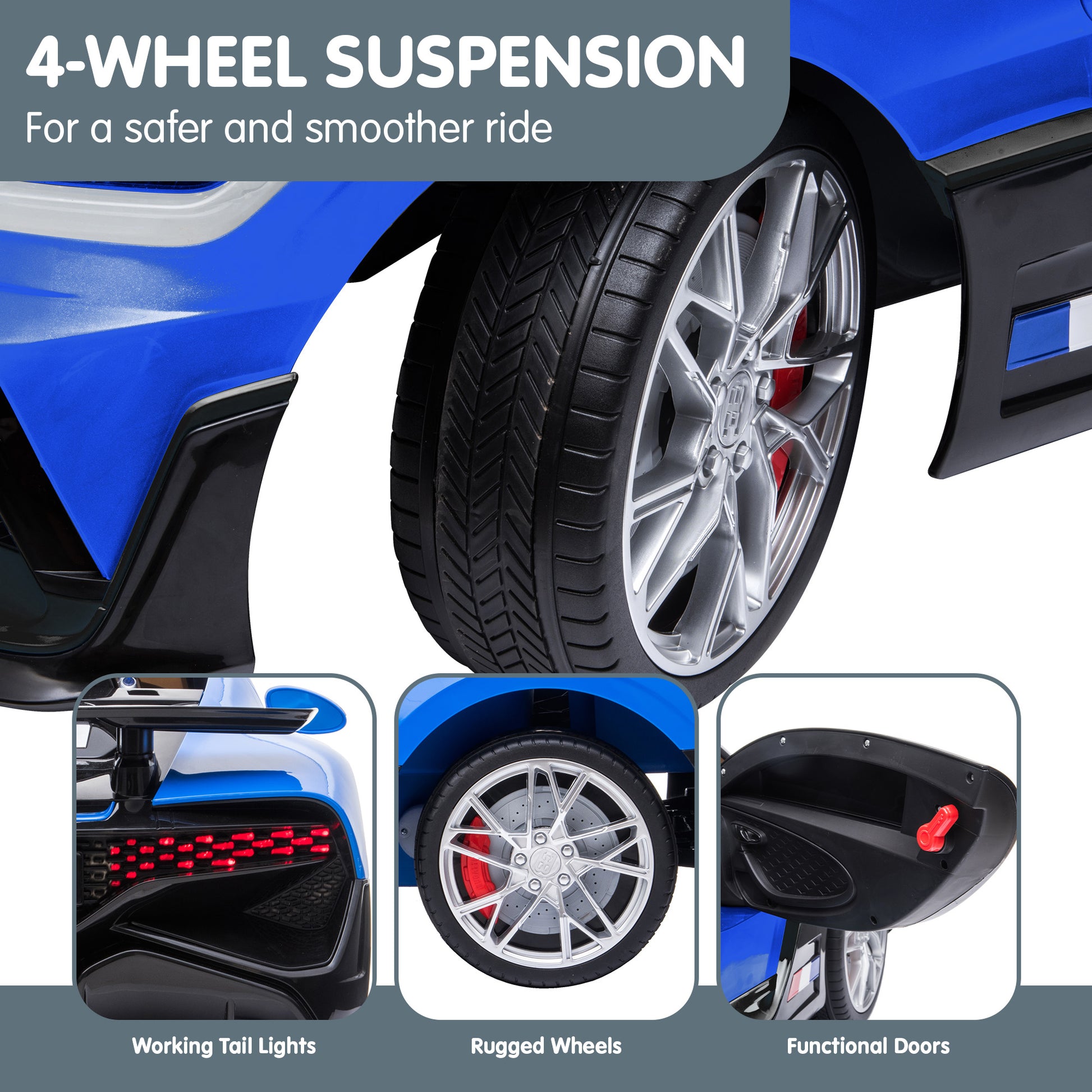 Embark on luxurious joyrides with the Bugatti Divo Electric Ride On Car! Licensed by Bugatti, this miniature marvel boasts a range of features. Its 4-wheel suspension system ensures a smooth, steady ride for all your childs adventures.